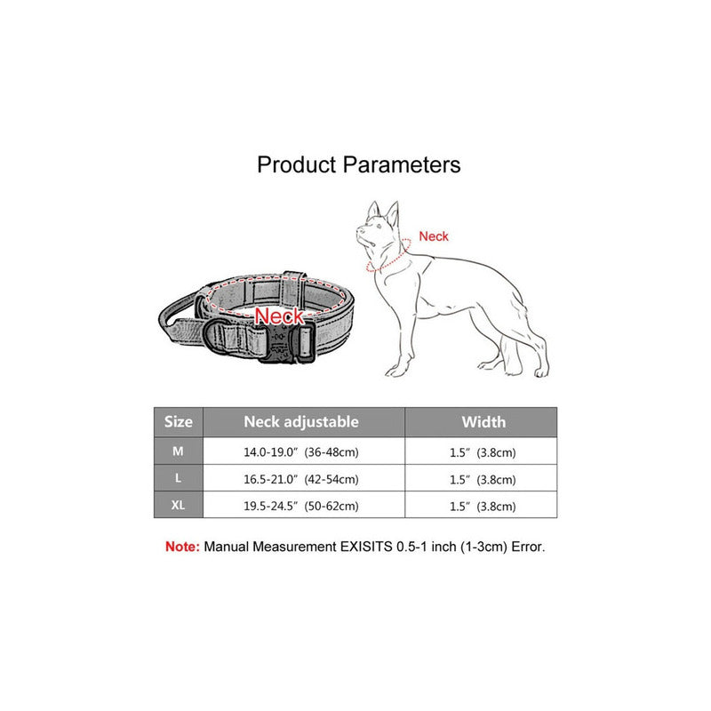 Collar talla XL Color: Verde. El collar táctico para perros está hecho de tela de nylon reforzado y hebilla de metal resistente. El collar ajustable para perros, está diseñado con un forro acolchado suave y transpirable, protegerá el cuello y el pelaje de tú perro. El collar de perro, tiene una asa que te permite agarrar fuertemente a tu perro, es perfecto para perros de tallas medianas y grandes. La hebilla de metal es ajustable, puede cambiar la longitud del collar según el tamaño del cuello de su perro. Disponible en talla: XL = Ajustable en el cuello entre 50 y 62 cm Ancho del collar = 3,8cm Para hacer la medición, se recomienda dejar 2 dedos entre el cuello y el collar. ----------------------------------------------- Respuestas a preguntas frecuentes ----------------------------------------------- - ¿Hacen envíos? Si, hacemos envíos a todo el país, a través de Mercado Envíos. Contamos con envío rápido a domicilio (o envíos Flex) sólo para Santiago, si compras antes de las 12:00 ¡Recibes el mismo día*! *Envío rápido a domicilio: Entregas entre 14:00 y 22:30. El cliente no puede elegir horario de entrega, por lo que debe estar disponible para recibir en dicha ventana horaria. ¡Si nos dejas tu correo el chofer te avisará cuando esté en camino! - ¿Cómo hago seguimiento del envío? En el detalle de tu compra puedes realizar el seguimiento de tus productos. - ¿Hace envíos a regiones? Si hacemos envíos a regiones Se realizan a sucursal de la empresa de correos de su conveniencia (starken, Chilexpress, valmontt, etc). Envíos por pagar. - Quiero comprar varios productos, ¿Puedo pagar un solo envío? Debes agregar los productos al carrito para que se agreguen en una sola compra y así Mercadolibre calcule un solo envío. - ¿Puedo retirar el artículo por una sucursal? Si, contamos con tienda física ubicada en Quinta Normal. - ¿Cómo se paga? Puedes pagar a través de todos los medios de pago que ofrece Mercado Pago. - ¿Qué hago si no estoy conforme con la compra? Cualquier problema que tengas, te pedimos que te contactes con nosotros mediante la mensajería directa para solucionarlo a la brevedad. ¡¡CUALQUIER OTRA DUDA, ESTAMOS A TU DISPOSICIÓN!! ¿Hacen Factura?: Sí, emitimos factura correspondiente y debes indicarnos por mensajería directa los datos para emisión. Este documento será el respaldo de tu transacción. Será emitido a más tardar el último día del mes realizada la compra y se podrá visualizar en el detalle de su compra. PRODUCTOS COMERCIALIZADOS POR METALFER